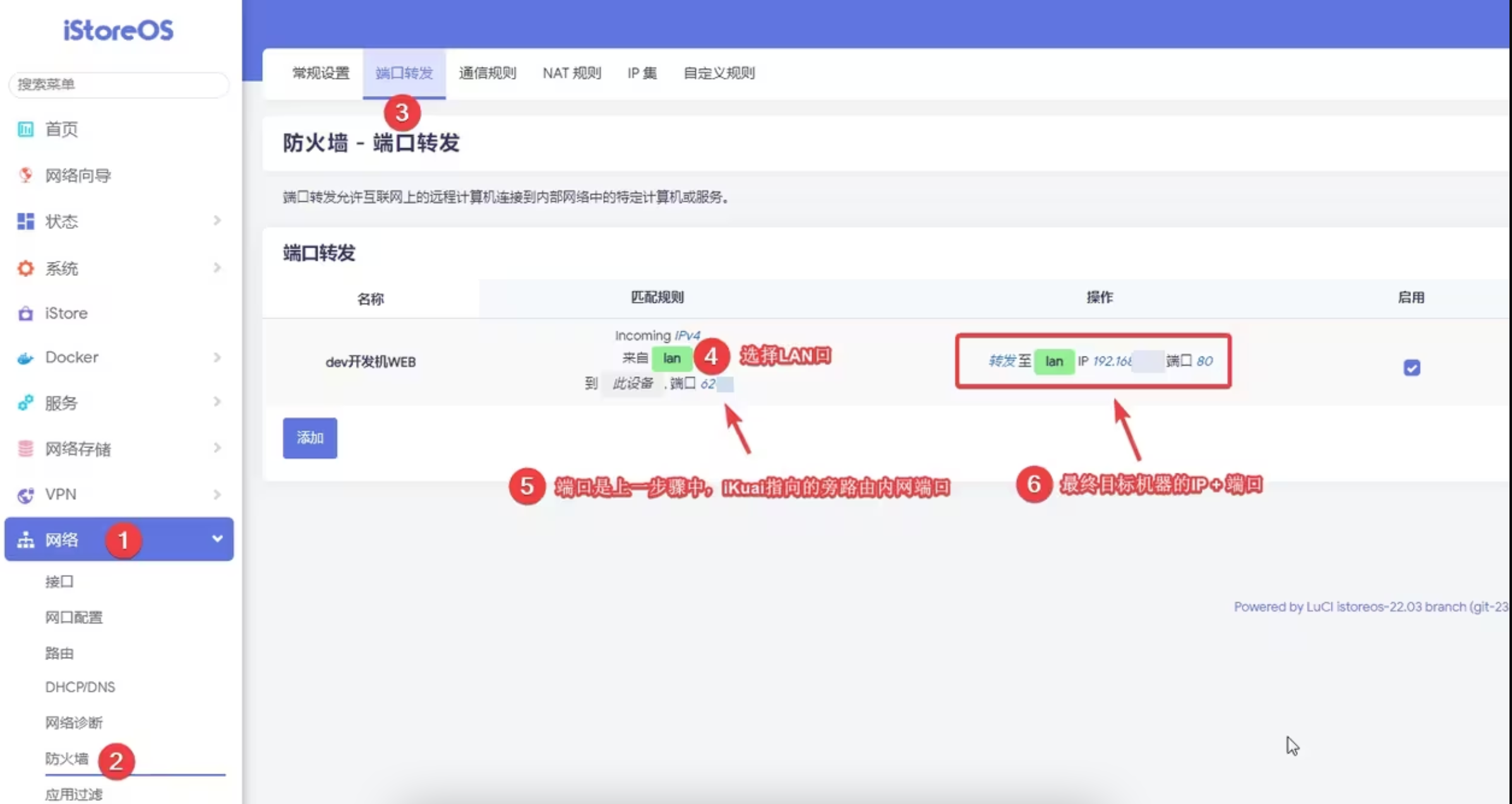 一、在“iKuai路由器后台 - 网络设置 - 端口映射”添加一条转发至旁路由的规则,如下图。