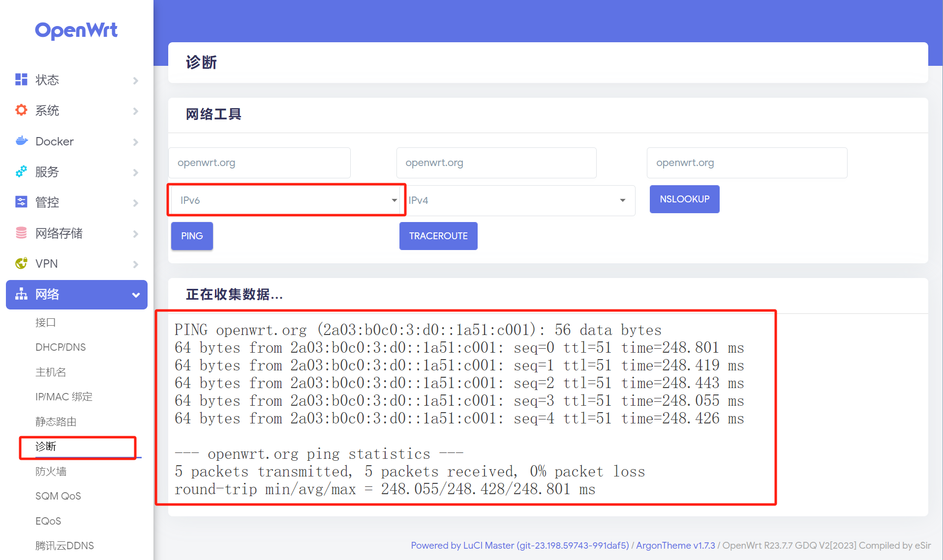 ▼ 打开 网络 -> 诊断,选择IPv6,PING一下,结果展示成功返回,说明IPv6设置成功了